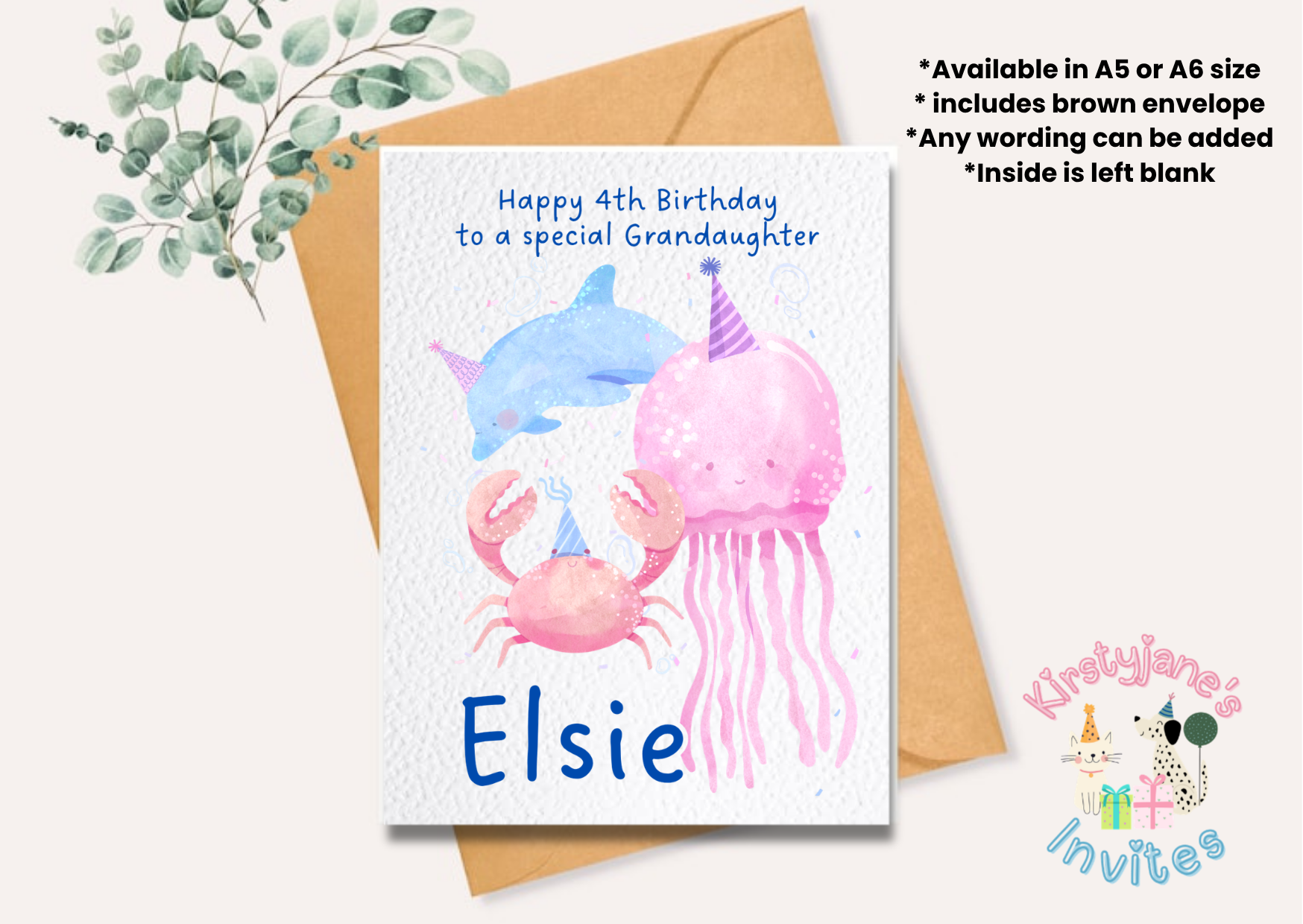 Birthday greetings card sea creatures animal dolphin jellyfish crab