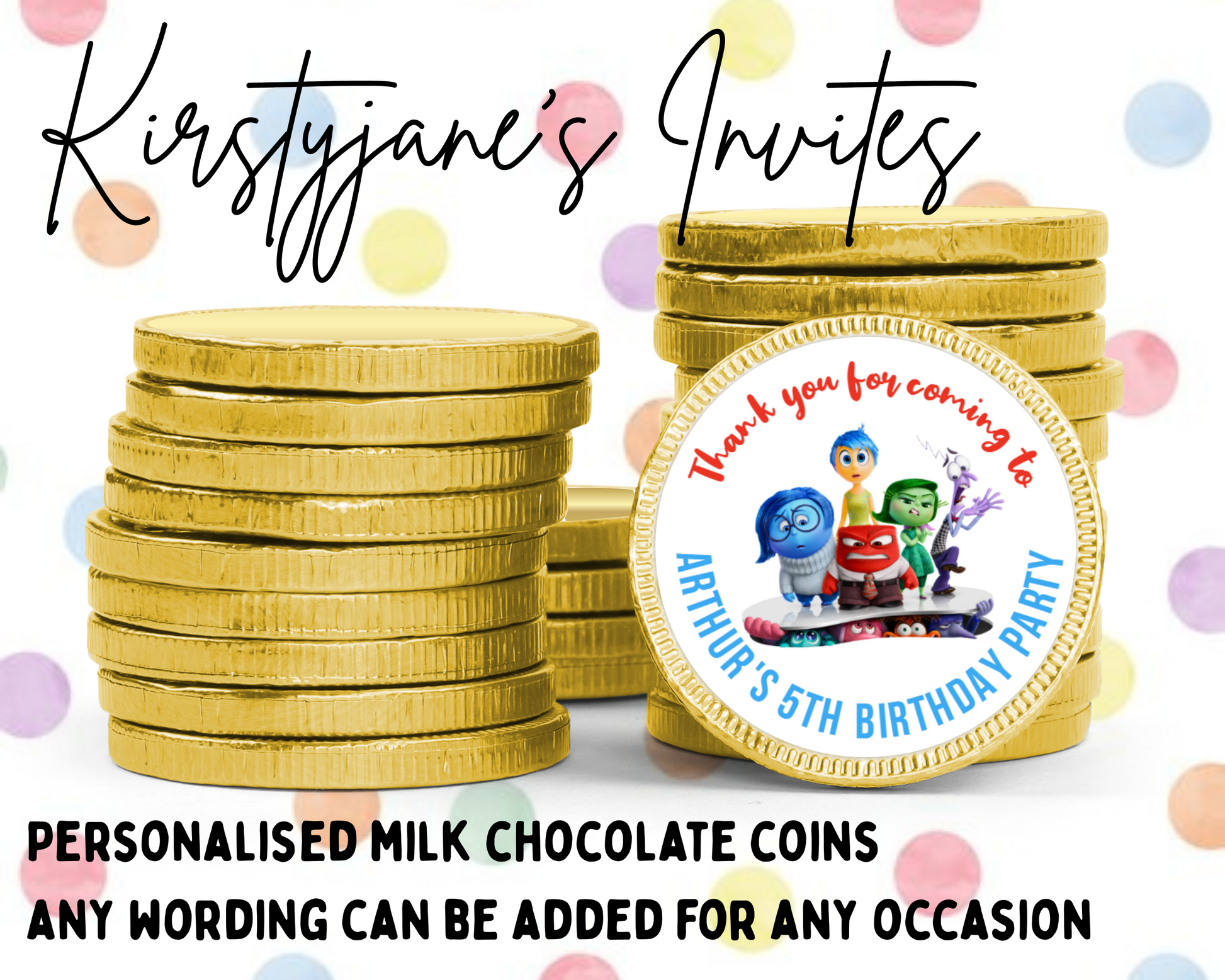 Personalised chocolate coins favours birthday party kids Boys girls inside out